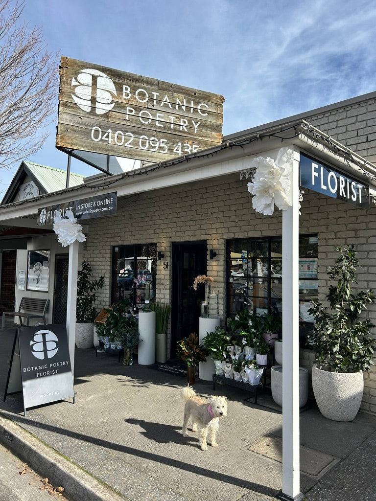 All our flowers and gifts are available at our studio in Woodside, up in the beautiful Adelaide hills. Come say hi to our team and meet the Botanic Poetry studio dog, Flower.